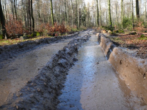 Holznutzung erfordert Rückegassen im Abstand von ca. 30 m. Zusammen mit LKW-fahrbaren Wegen und sonstigen Erdwegen gehen dem Wald rund 20 % seiner Fläche verloren und Böden werden geschädigt.